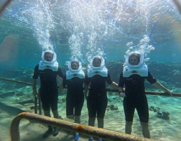We thought we’d just be doing some snorkelling, but we were given the opportunity to do a Sea Trek, using bubble helmets, so of course we all said yes! After receiving a safety talk and getting changed into wetsuits and swim shoes, we were walked to the end of the pier and one at a time descended down the stairs where we stopped whilst the helmets were connected to the oxygen tubes and then placed over our heads, before the diver then escorted down the rest of the steps to the seafloor.